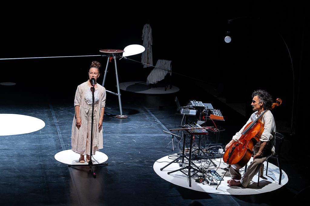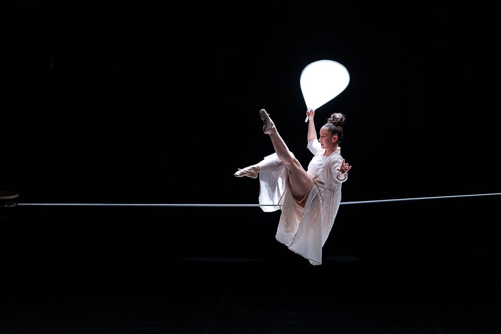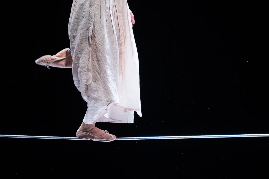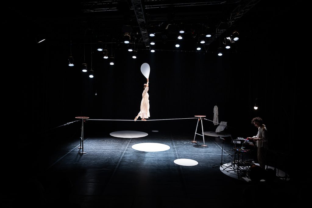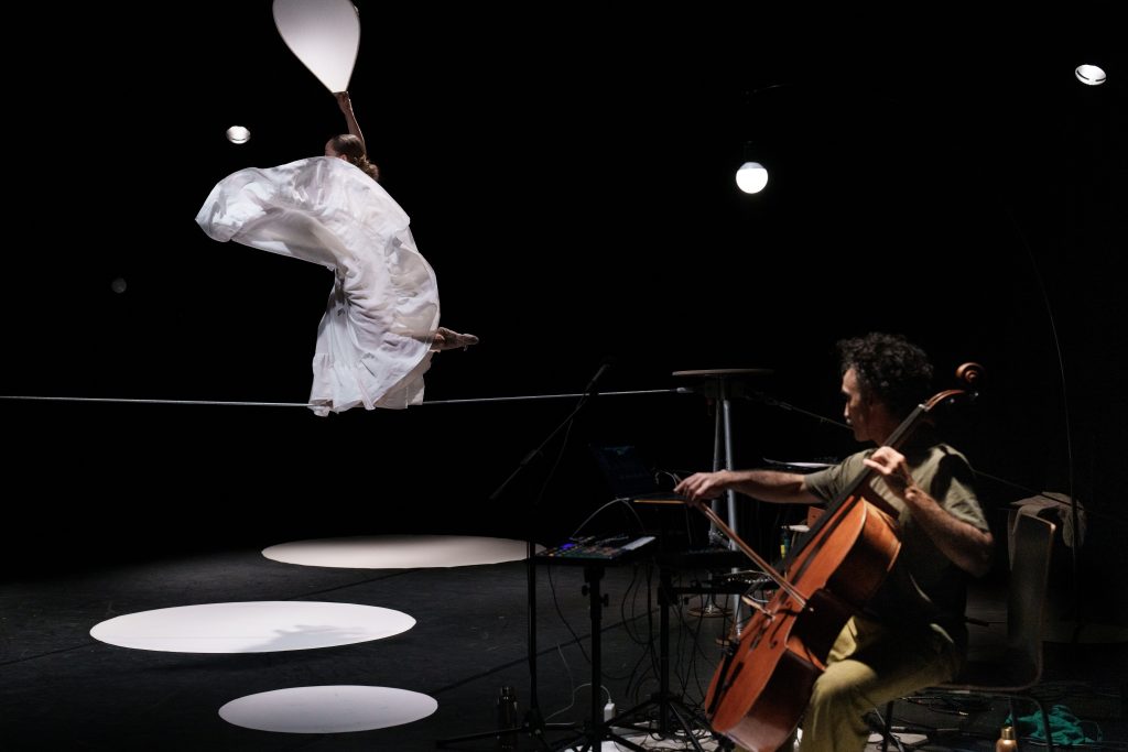 Series of is a concert-like duet by the tightwire dancer Mira Ravald and the musician-composer Antonio Alemanno. Blurring the lines between movement and sound, the performance transforms a tight wire into a musical instrument, resonating through balance and physical contact, combined with the sounds of a cello and electronics. Live music, circus, dance, and soundscape intertwine, creating a dialogue where movement and music emerge from one another. Inspired by the imagery of the sea, Series of invites you to hear motion and see s